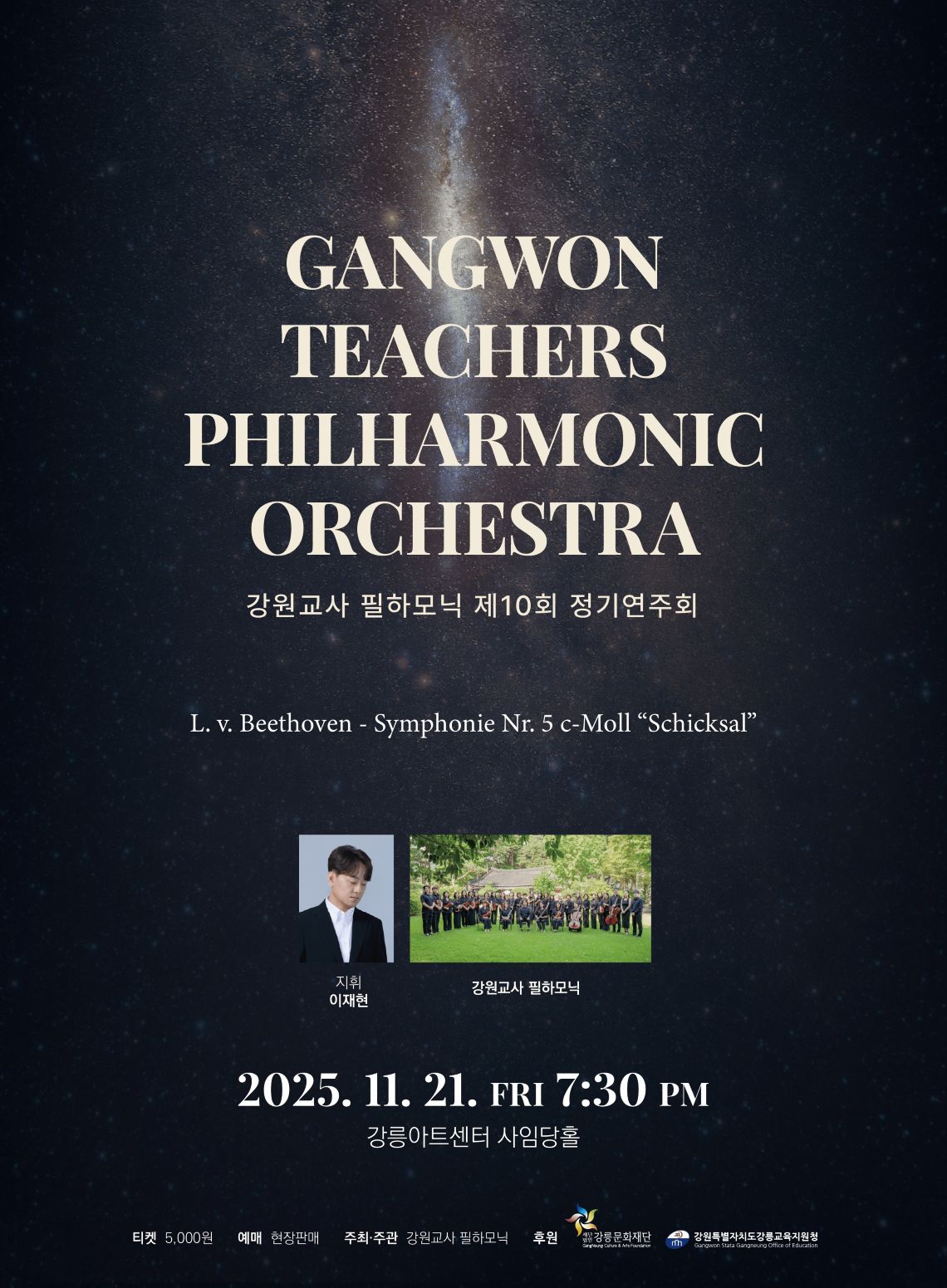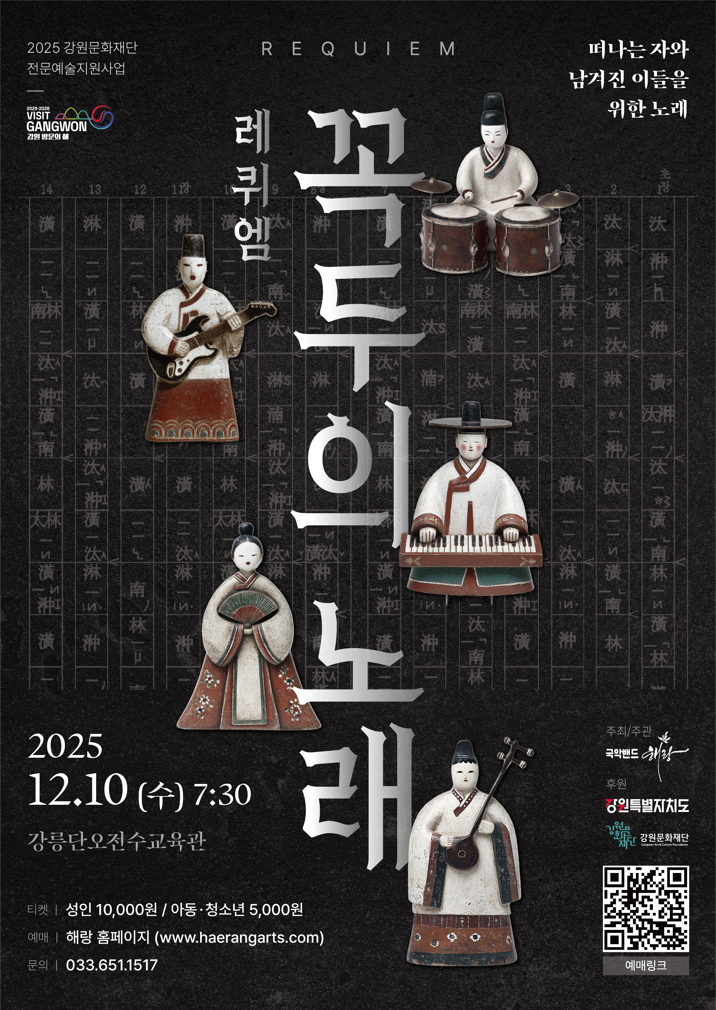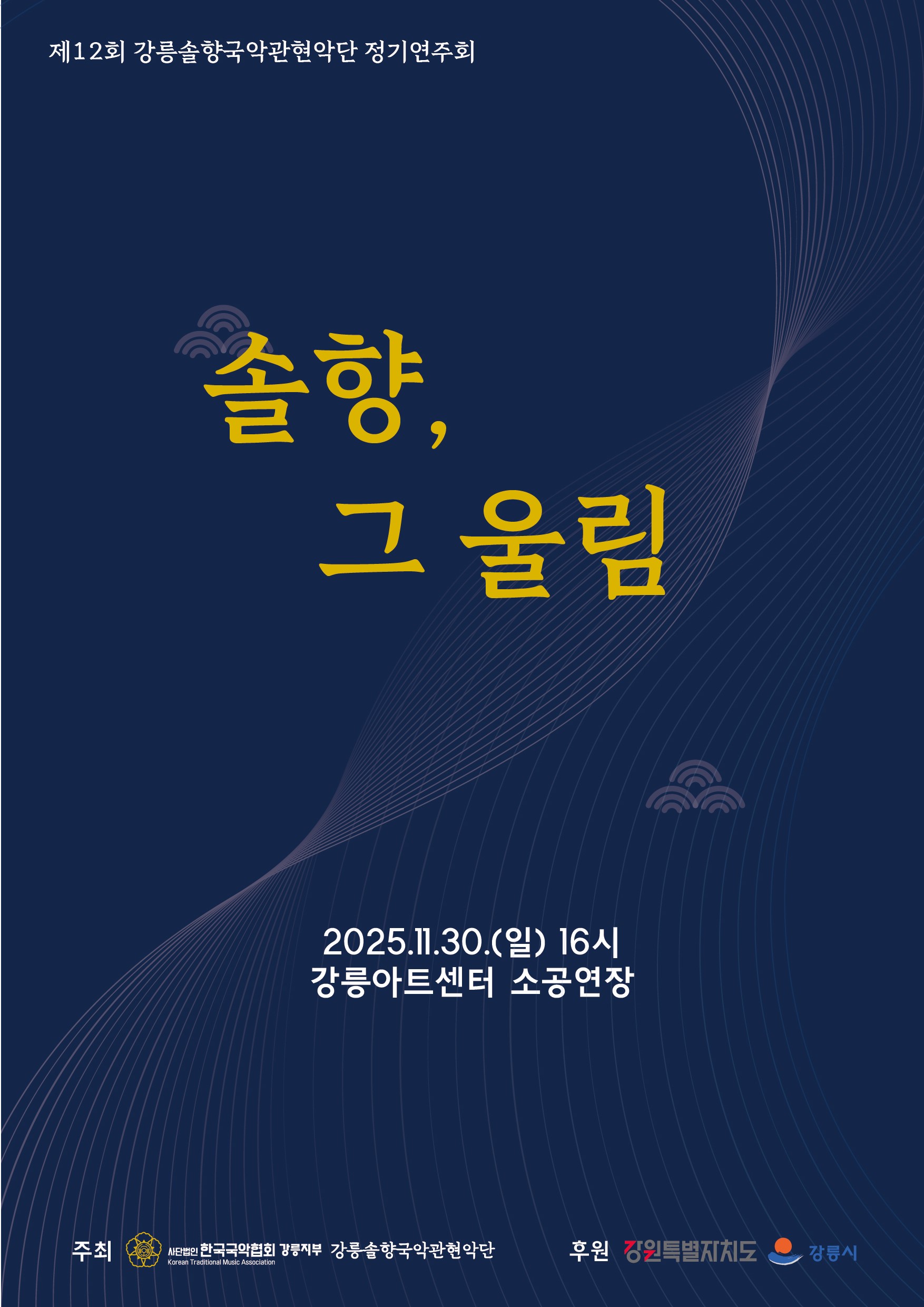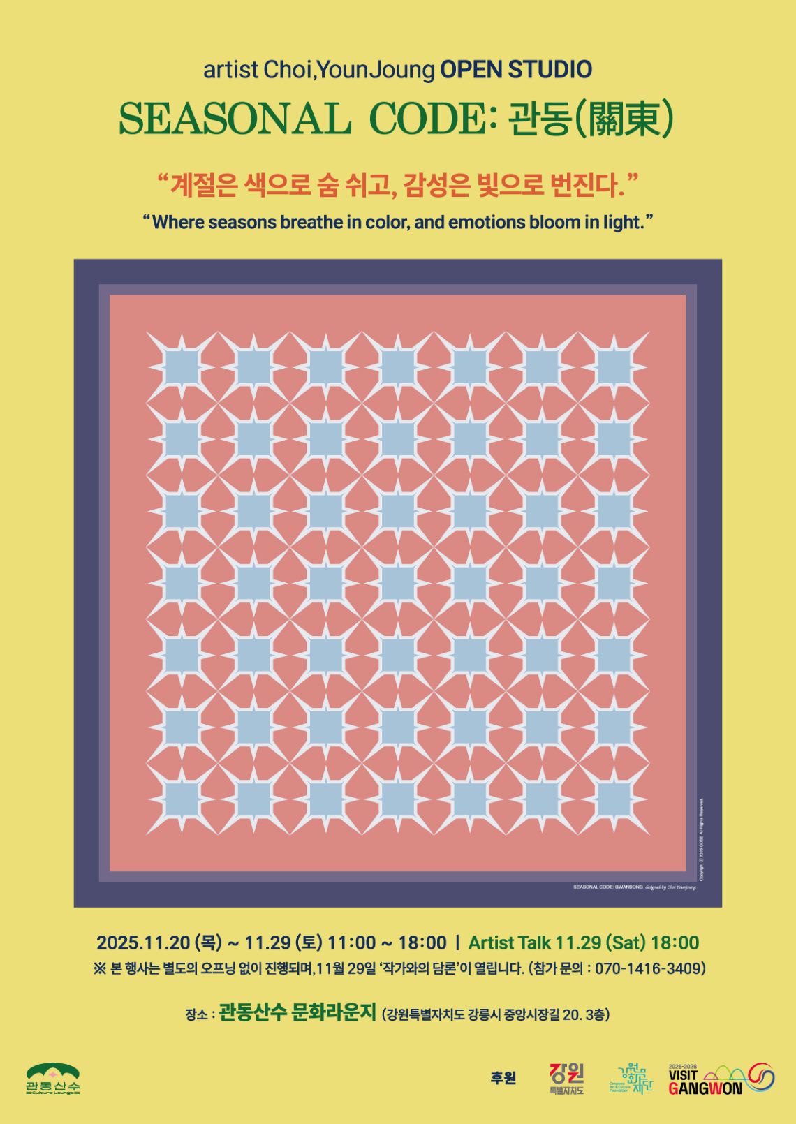 [한국여성수련원] 2026년 (재)한국여성수련원 갤러리 '솔' 전시 지원 공모 2025.11.27 [삼척관광문화재단] 2025 이사부나이트시네마 2025.11.17 [강원문화재단] 2025년 강원예술인 마음치유 심리검사 지원사업 2025.11.14 [원주문화재단] 2025 원주문화재단 기획공연 <무악지우> 2025.11.10 [강릉시] 시 승격 70주년 기념 '강릉시민 대화합 한마당' 2025.10.21