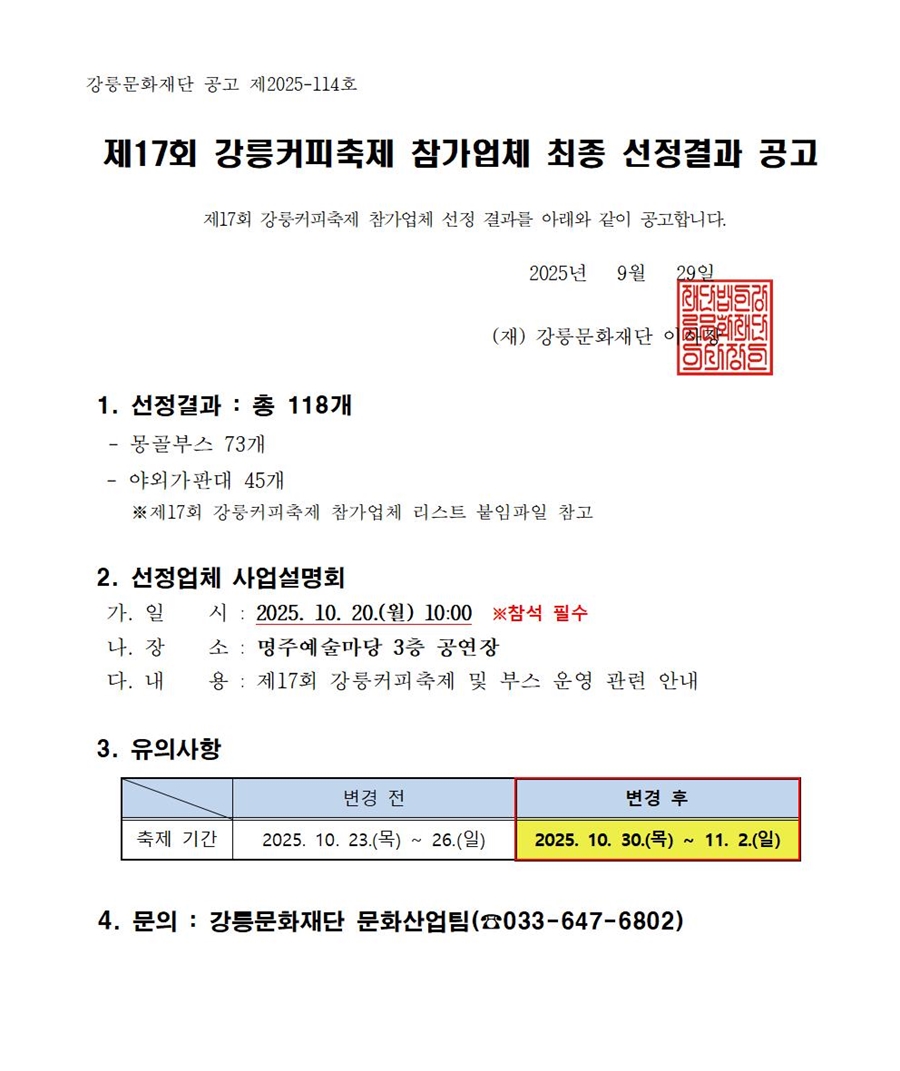 [공고] 제17회 강릉커피축제 참가업체 최종 선정 결과 공고