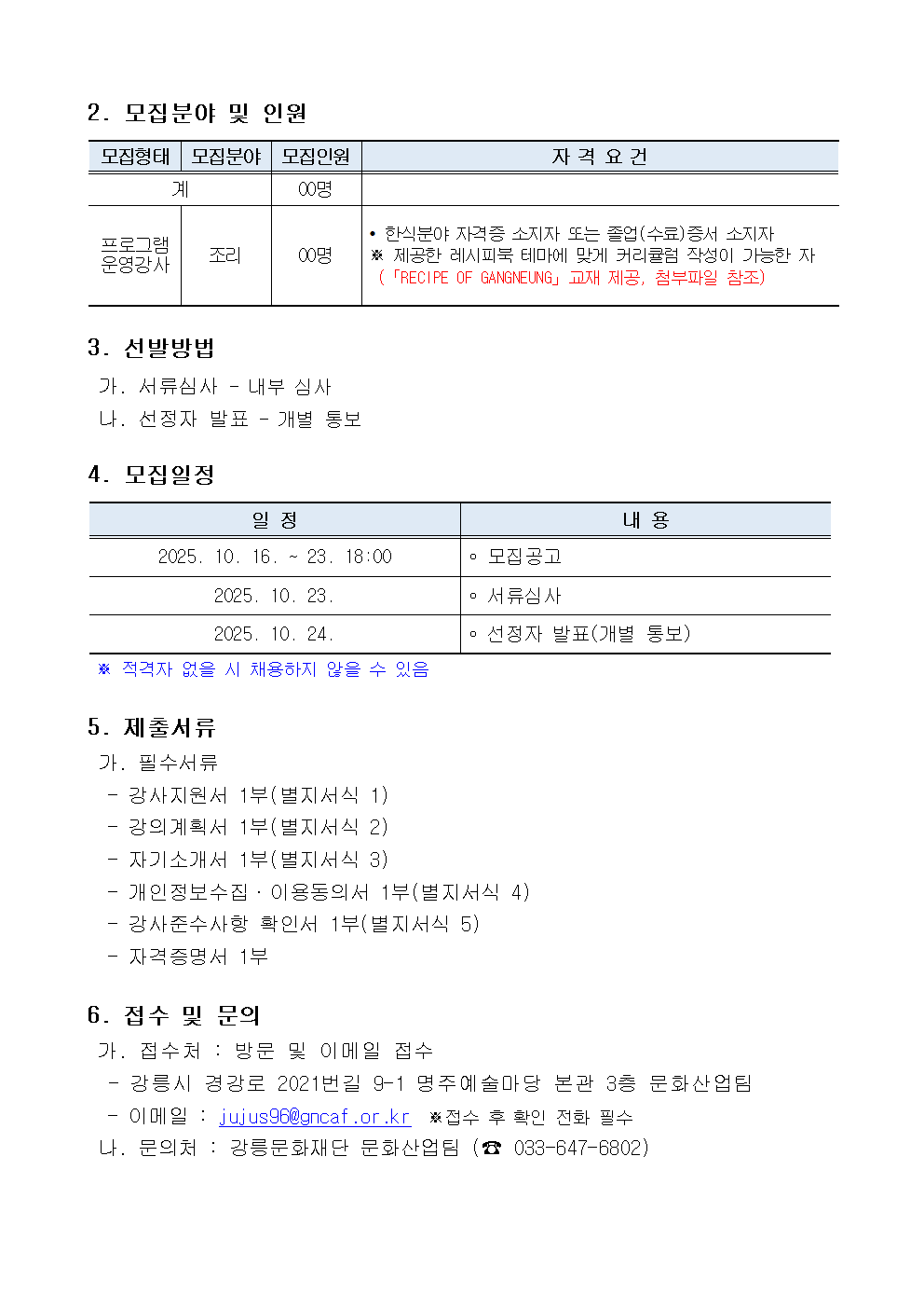 [공고]「밑반찬으로 만나는 강릉의 맛」쿠킹 클래스 3기 강사 모집 공고