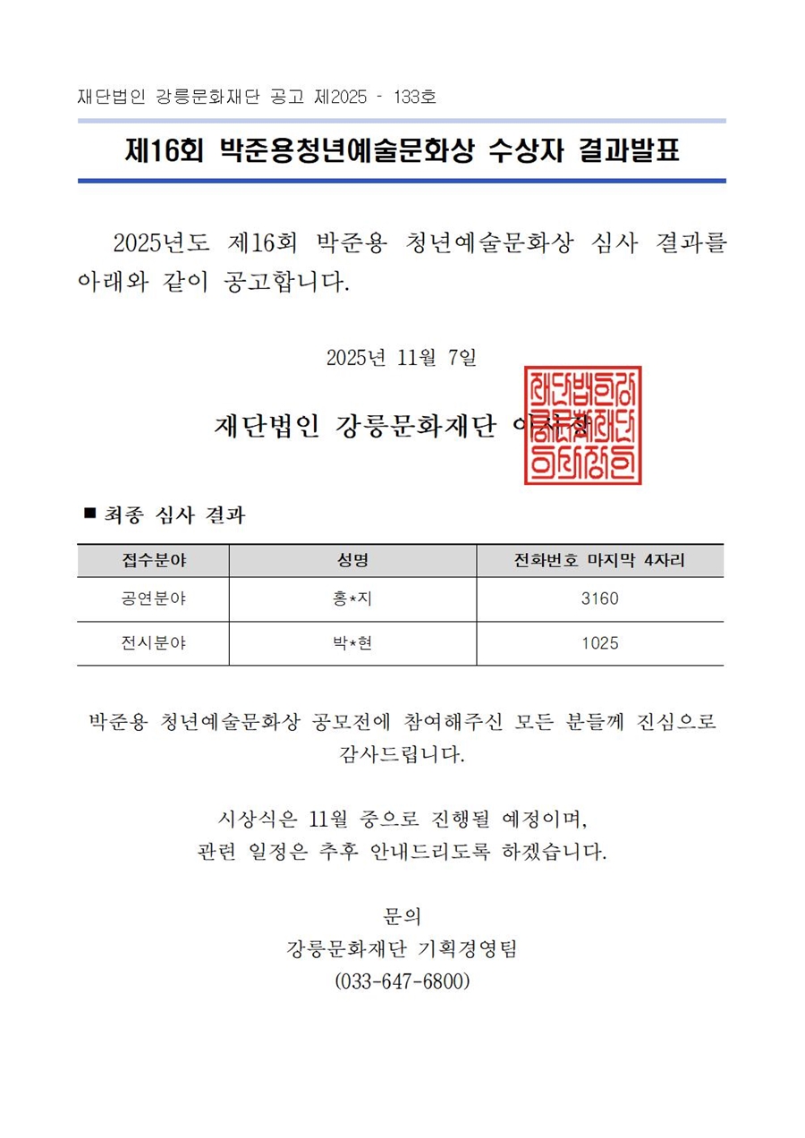 제16회 박준용청년예술문화상 수상자 결과 발표
