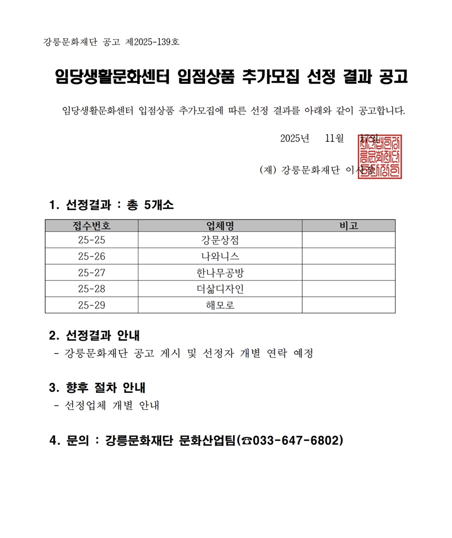 임당생활문화센터 입점업체 추가모집 최종선정결과 공고