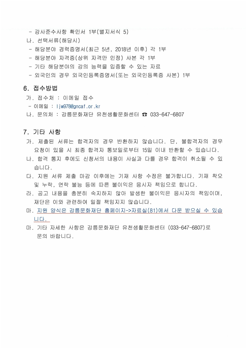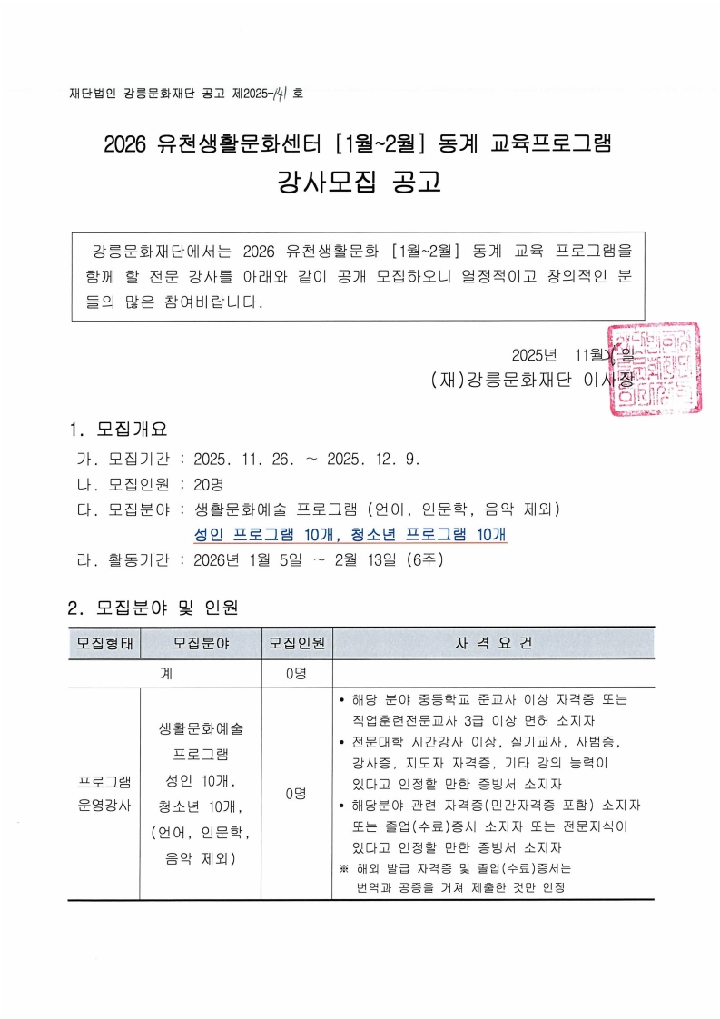 2026 유천생활문화센터 [1월~2월] 동계 교육프로그램 강사모집 공고