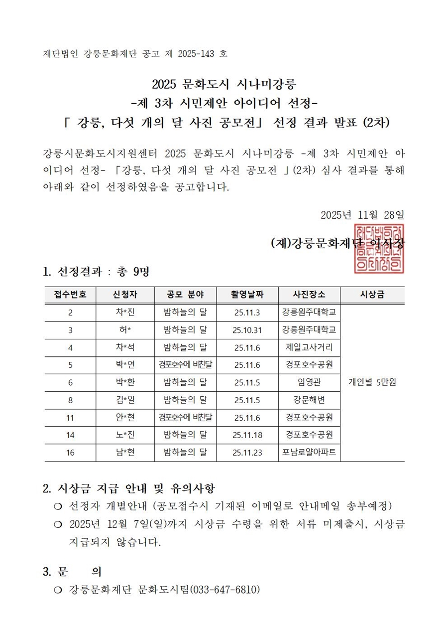 - 제3차 시민제안 아이디어 선정 -「강릉, 다섯개의 달 사진 공모전」공모 선정 결과발표(2차)