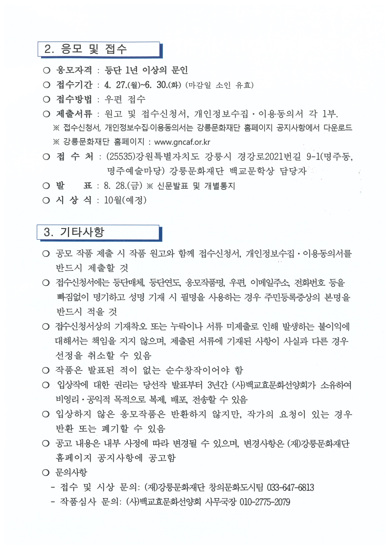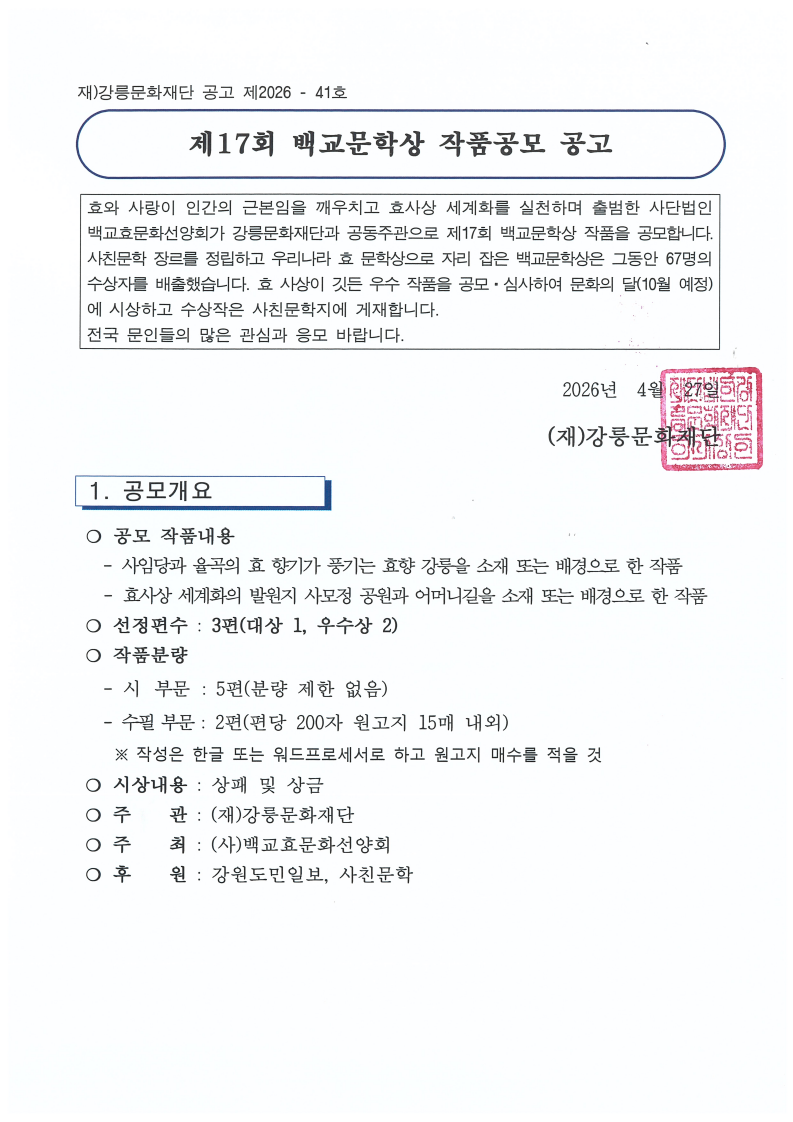 제17회 백교문학상 작품 공모 공고 강릉문화재단 39 2026.04.27 09:11 제17회 백교문학상 신청서.hwp (72192 Bytes) 제17회 백교문학상 개인정보 수집·이용 동의서.hwp (52224 Bytes) 이전글 이전글이 없습니다. 다음글 제17회 백교문학상 작품 공모 공고2026.04.27 09:11 목록으로