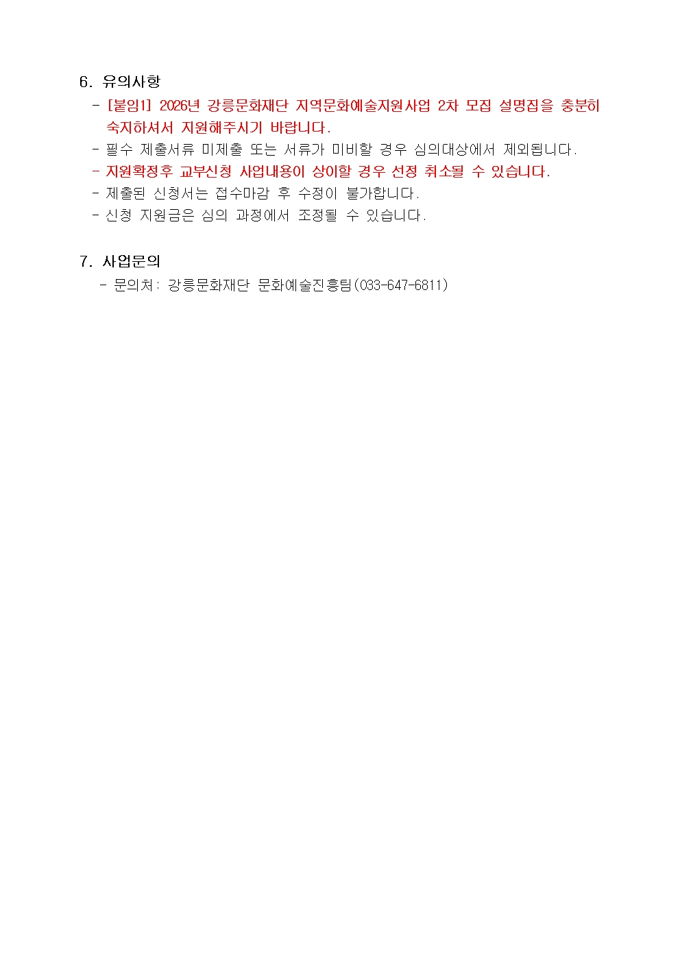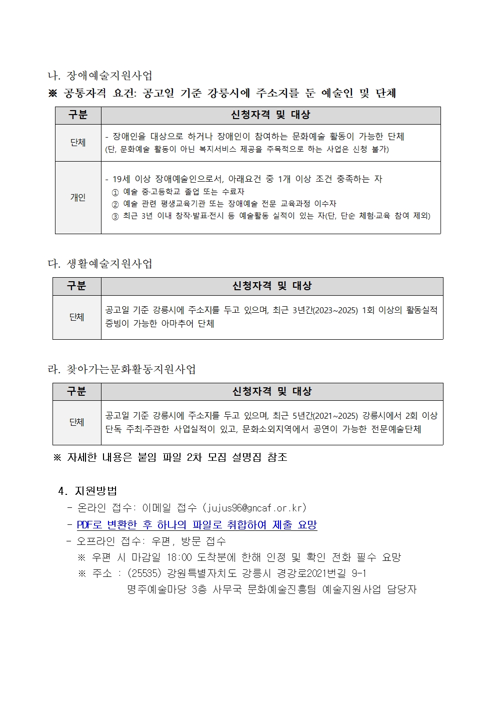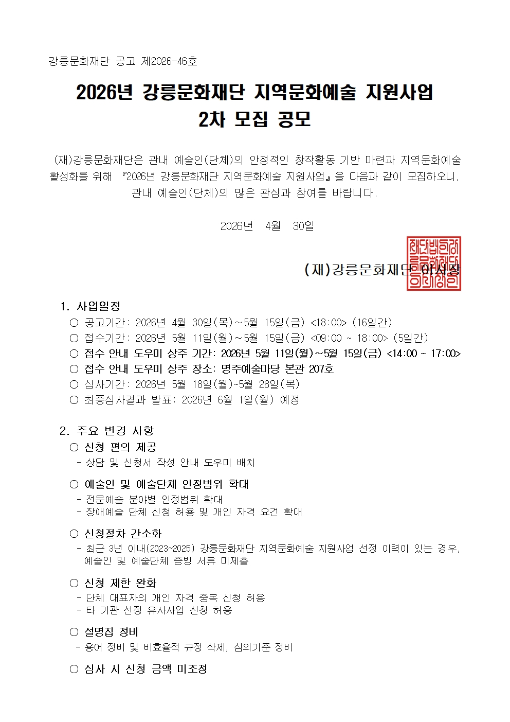 [공고] 2026년 강릉문화재단 지역문화예술지원사업 2차 모집 공고 강릉문화재단 43 2026.04.30 17:28 2026년 강릉문화재단 지역문화예술지원사업 2차 모집 공고.pdf (182738 Bytes) 2026년 강릉문화재단 지역문화예술지원사업 2차 모집 설명집_최종.pdf (924702 Bytes) [서식1] 2026년 전문예술지원사업 지원신청서.hwp (77824 Bytes) [서식2] 2026년 장애예술지원사업 지원신청서.hwp (81408 Bytes) [서식3] 2026년 생활예술지원사업 지원신청서.hwp (72704 Bytes) [서식4] 2026년 찾아가는문화활동지원사업 지원신청서.hwp (74752 Bytes) 이전글 [공고] 2026년 강릉문화재단 지역문화예술지원사업 2차 모집 공고2026.04.30 17:28 다음글 [공고] 2026년 강릉문화재단 청년신진예술인지원사업 공고2026.04.30 14:49 목록으로