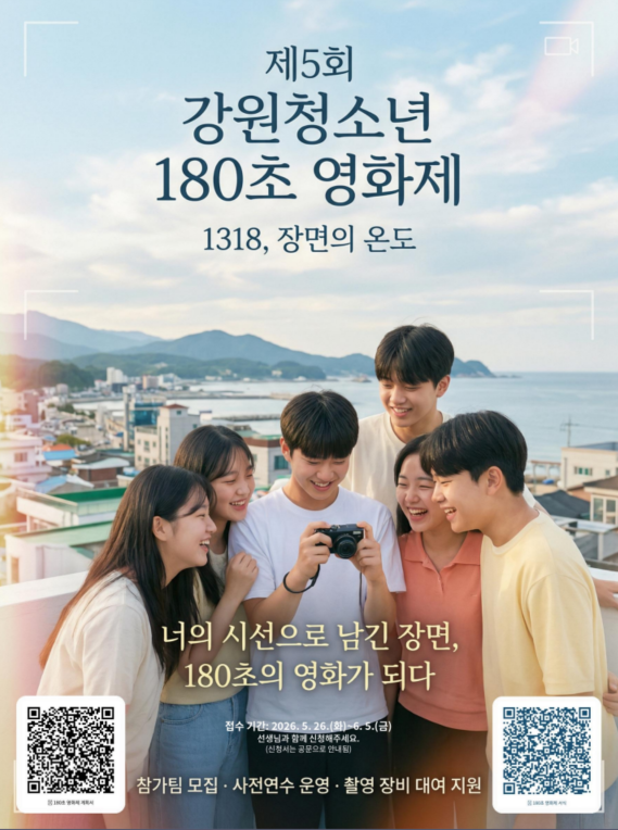 제 5회 강원청소년 180초 영화제 <부제: 1318, 장면의 온도 > 강릉문화재단 15 2026.04.20 09:13 첨부파일이 없습니다. 이전글 (재)횡성문화관광재단 「2026시즌 횡성루지체험장」개장2026.04.20 15:44 다음글 제 5회 강원청소년 180초 영화제 <부제: 1318, 장면의 온도 >2026.04.20 09:13 목록으로