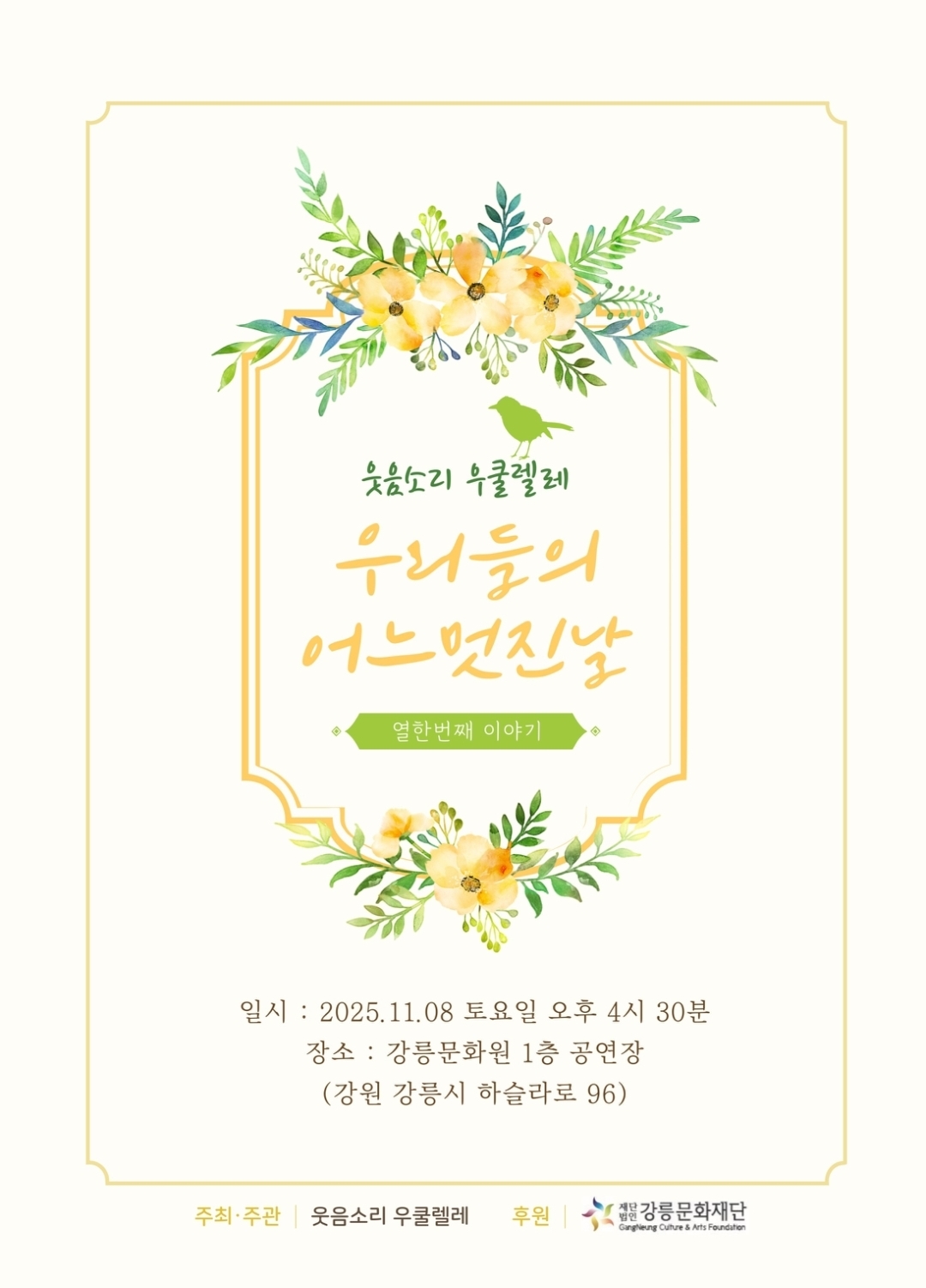 [삼척관광문화재단] 2025 이사부나이트시네마 2025.11.17 [강원문화재단] 2025년 강원예술인 마음치유 심리검사 지원사업 2025.11.14 [원주문화재단] 2025 원주문화재단 기획공연 <무악지우> 2025.11.10 [강릉시] 시 승격 70주년 기념 '강릉시민 대화합 한마당' 2025.10.21 [강릉시] 2025 강원특별자치도 청년의 날 2025.10.21
