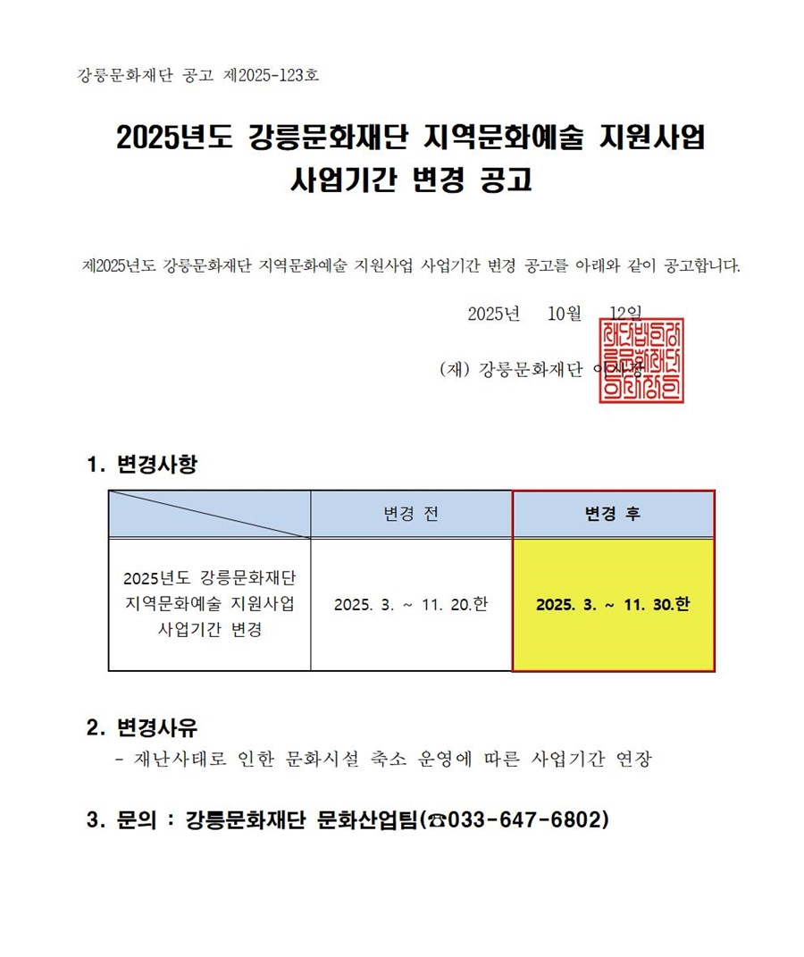 2025년도 강릉문화재단 지역문화예술 지원사업 사업기간 변경 공고.pdf (53 KB)
