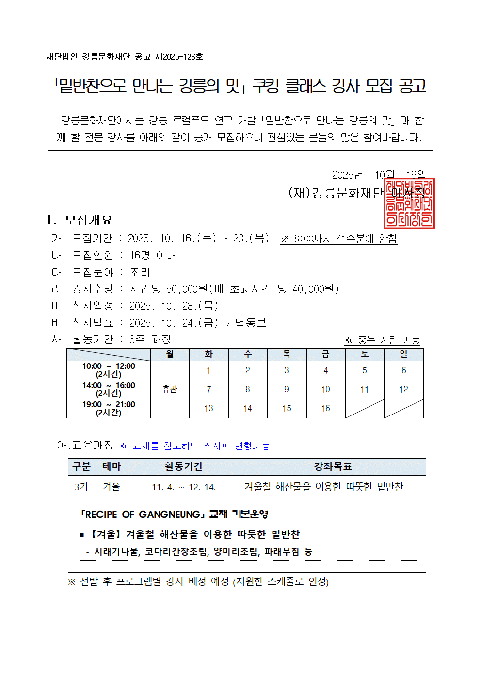 [공고]「밑반찬으로 만나는 강릉의 맛」쿠킹 클래스 3기 강사 모집 공고