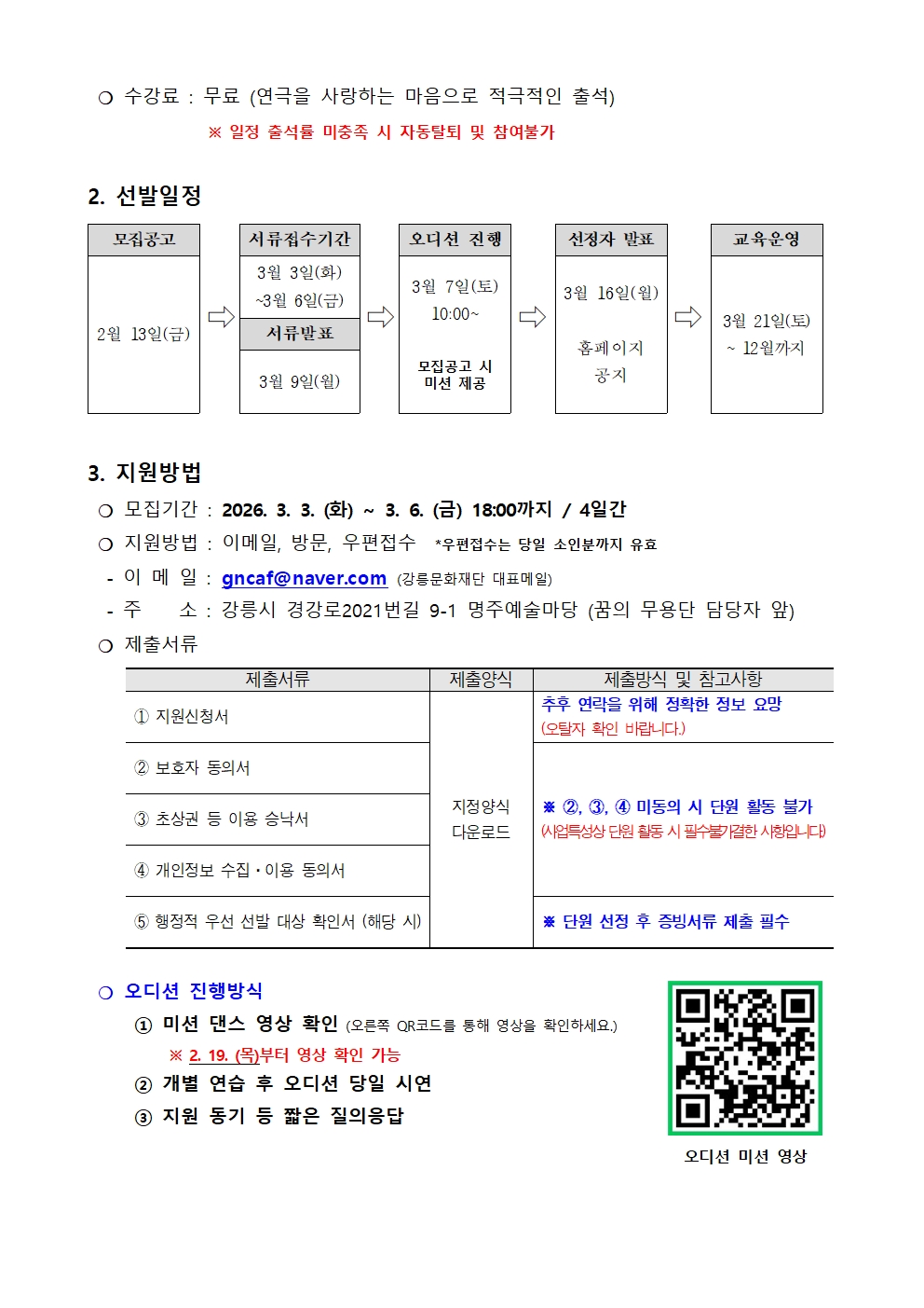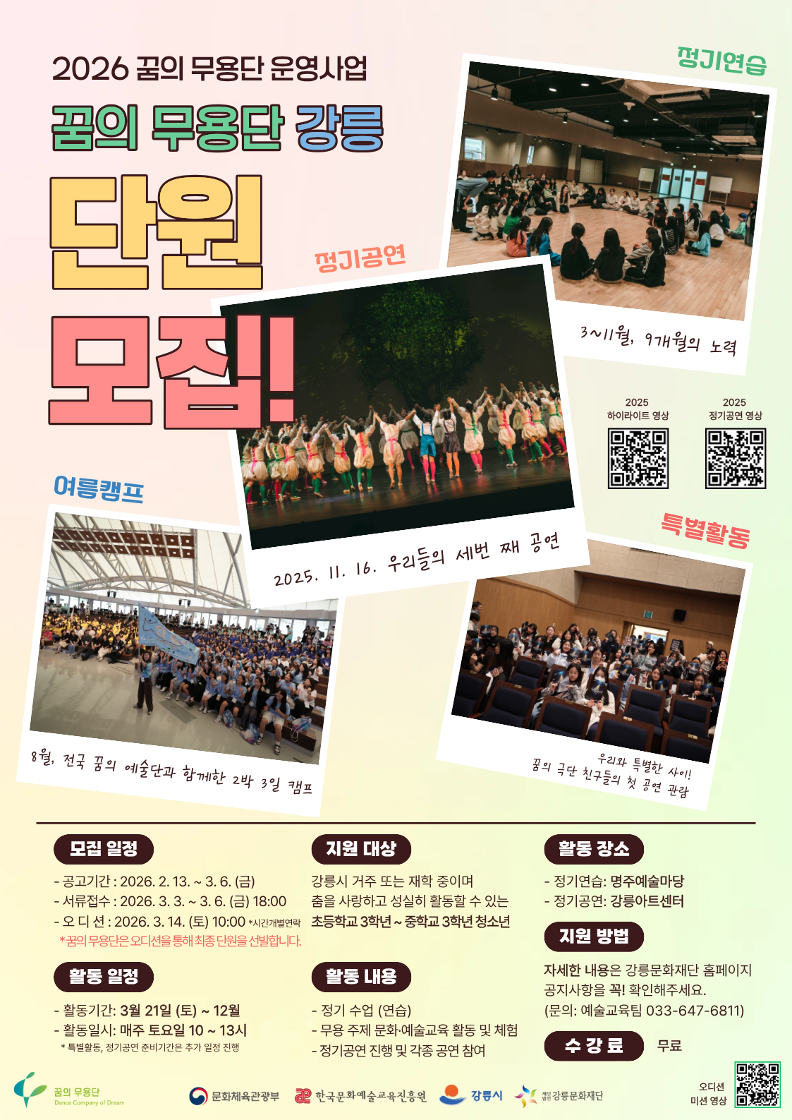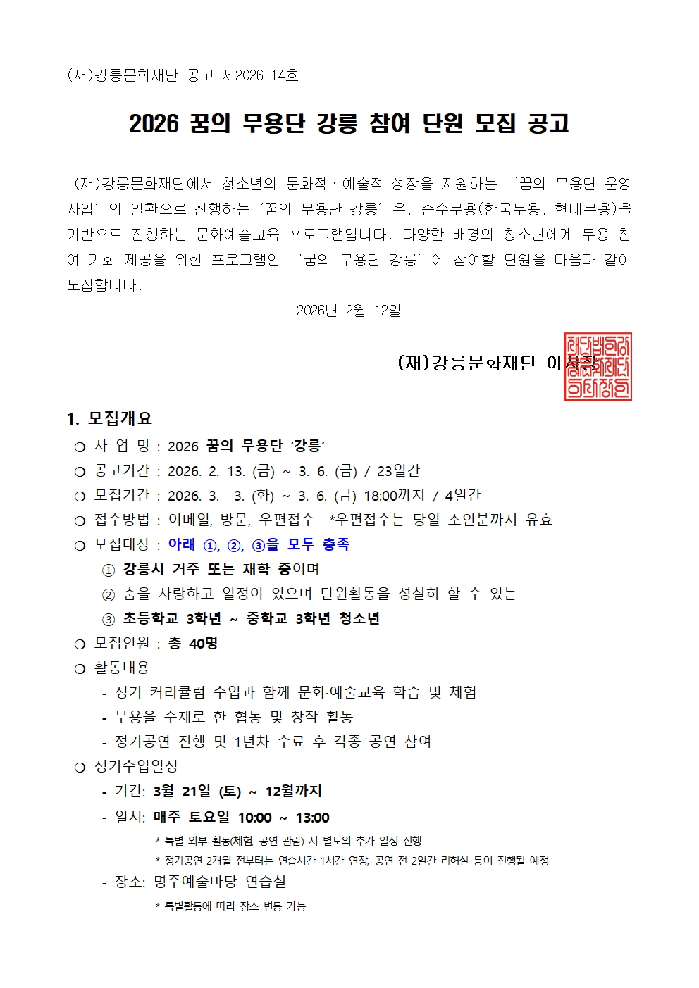 [모집] 2026 꿈의 무용단 '강릉' 신규 단원 모집 (~3.6.) 강릉문화재단 22 2026.02.13 17:40 1. 공고문.pdf (696202 Bytes) 2. 제출서식.hwpx (919220 Bytes) 이전글 [모집] 2026 꿈의 극단 '강릉' 신규 단원 모집 (~3.6.)2026.02.13 17:42 다음글 [모집] 2026 꿈의 무용단 '강릉' 신규 단원 모집 (~3.6.)2026.02.13 17:40 목록으로