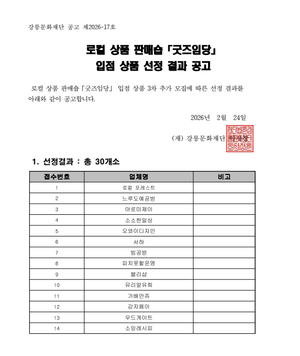 로컬 상품 판매숍[굿즈임당] 입점 상품 선정 결과 공고 강릉문화재단 61 2026.02.24 13:48 첨부파일이 없습니다. 이전글 이전글이 없습니다. 다음글 로컬 상품 판매숍[굿즈임당] 입점 상품 선정 결과 공고2026.02.24 13:48 목록으로