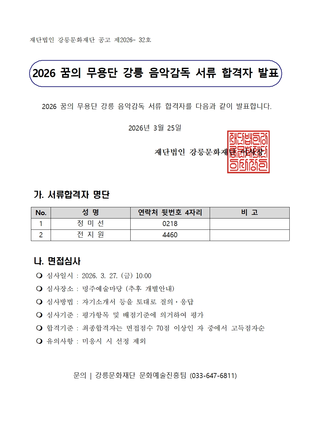 [공고] 2025 꿈의 무용단 강릉 음악감독 서류 합격자 발표 강릉문화재단 74 2026.03.25 09:13 첨부파일이 없습니다. 이전글 이전글이 없습니다. 다음글 [공고] 2025 꿈의 무용단 강릉 음악감독 서류 합격자 발표2026.03.25 09:13 목록으로