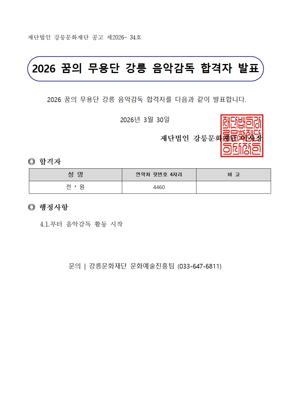 [공고]2026 꿈의 무용단 강릉 음악감독 합격자 발표 강릉문화재단 49 2026.03.30 09:21 첨부파일이 없습니다. 이전글 [공고]2026 꿈의 무용단 강릉 음악감독 합격자 발표2026.03.30 09:21 다음글 [공고] 2026 꿈의 무용단 강릉 음악감독 서류 합격자 발표2026.03.25 09:13 목록으로