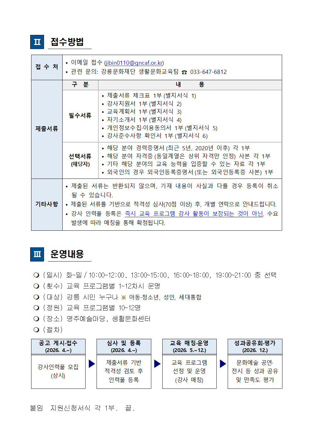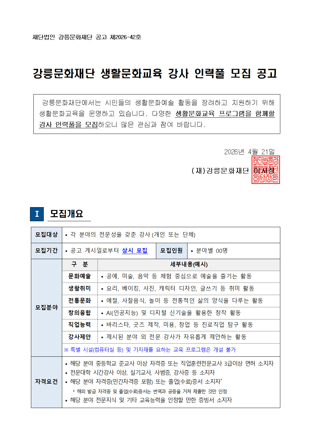 [모집] 생활문화교육 강사 인력풀 상시 모집 강릉문화재단 59 2026.04.21 14:11 [공고] 2026년 생활문화교육 강사 인력풀 상시 모집.pdf (213606 Bytes) 생활문화교육 강사 인력풀 지원신청 서식.hwp (147968 Bytes) 이전글 [모집] 생활문화교육 강사 인력풀 상시 모집2026.04.21 14:11 다음글 문화가 있는 날 강릉 「BuskingWave 강릉」 참가팀 모집 공고2026.04.20 08:54 목록으로