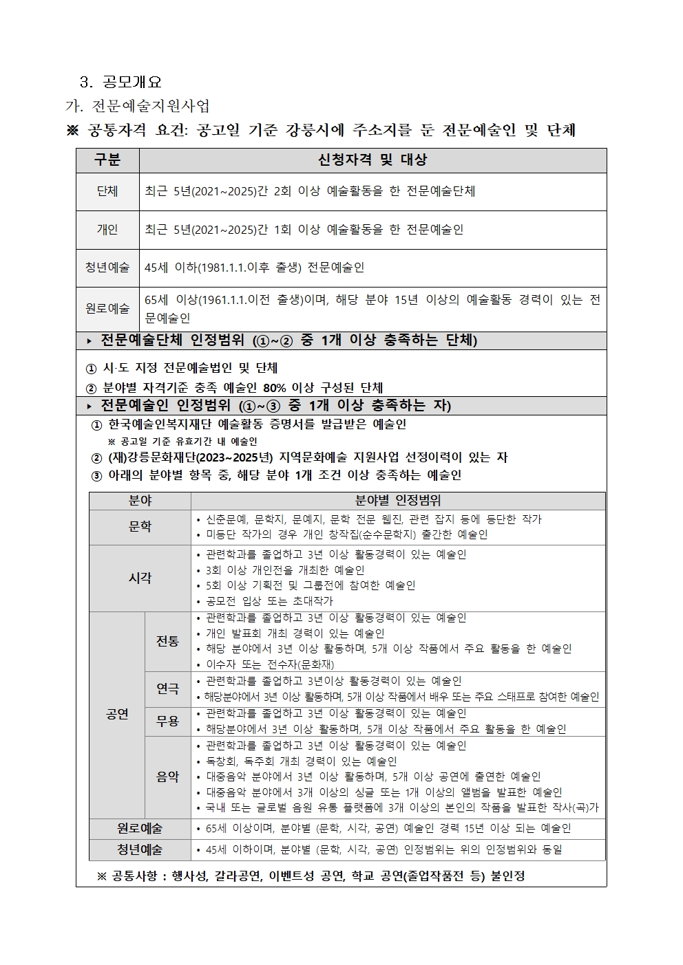 [공고] 2026년 강릉문화재단 지역문화예술지원사업 2차 모집 공고 강릉문화재단 43 2026.04.30 17:28 2026년 강릉문화재단 지역문화예술지원사업 2차 모집 공고.pdf (182738 Bytes) 2026년 강릉문화재단 지역문화예술지원사업 2차 모집 설명집_최종.pdf (924702 Bytes) [서식1] 2026년 전문예술지원사업 지원신청서.hwp (77824 Bytes) [서식2] 2026년 장애예술지원사업 지원신청서.hwp (81408 Bytes) [서식3] 2026년 생활예술지원사업 지원신청서.hwp (72704 Bytes) [서식4] 2026년 찾아가는문화활동지원사업 지원신청서.hwp (74752 Bytes) 이전글 [공고] 2026년 강릉문화재단 지역문화예술지원사업 2차 모집 공고2026.04.30 17:28 다음글 [공고] 2026년 강릉문화재단 청년신진예술인지원사업 공고2026.04.30 14:49 목록으로